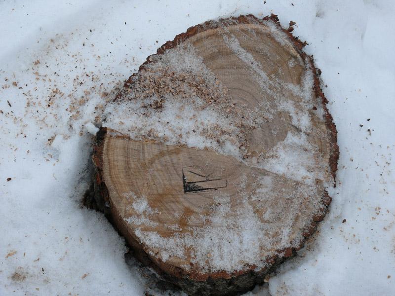 Проте, уява підвела. На нас чекав лише спокійний густий ліс поряд з болотом та попиляний сухостій. Зустрічалися поодинокі свіжі пеньки, які в діаметрі були від 5 до 30 сантиметрів. Також ми знайшли пару спиляних дерев, вражених блискавкою чи пожежею. Почали з’являтися думки, що пиляли дерева для топіння печі й не більше. На тонкомірних пеньках стояв штамп з літерою «К», який, як пізніше нам пояснив лісник, означає «контроль».