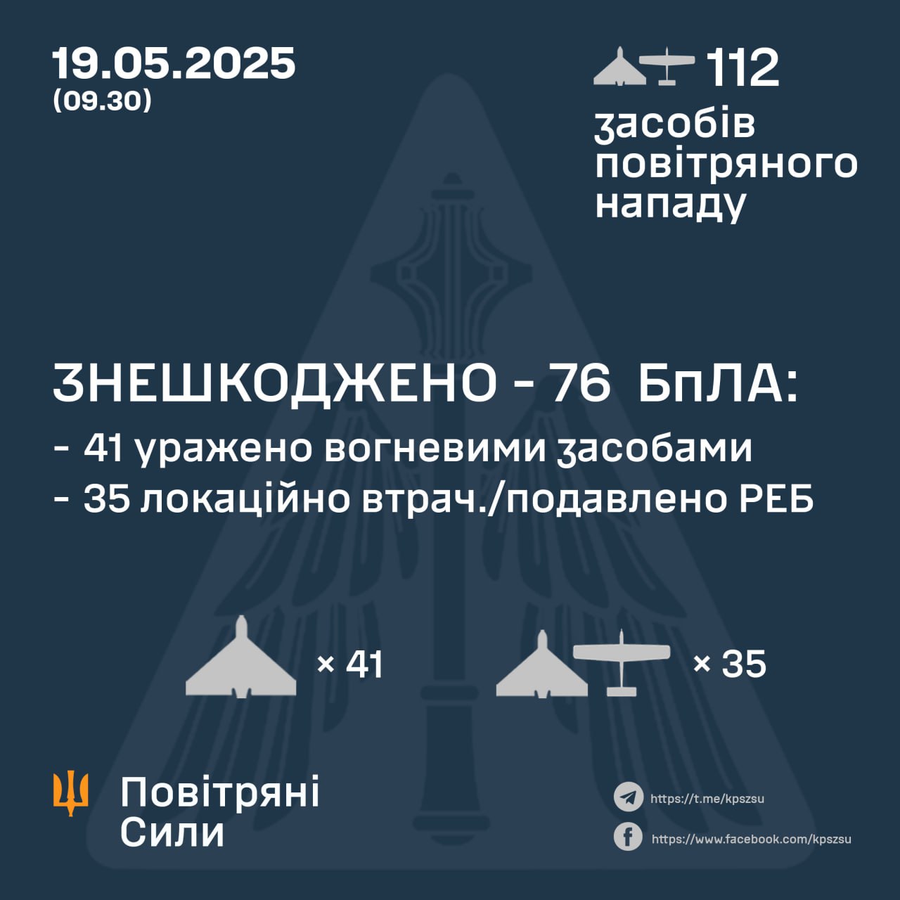У ніч на 19 травня (із 23.00 18 травня) противник атакував 112-ма ударними БпЛА типу Shahed і безпілотниками-імітаторами різних типів із напрямків: Брянськ, Курськ, Шаталово, Орел, Міллерово – рф.