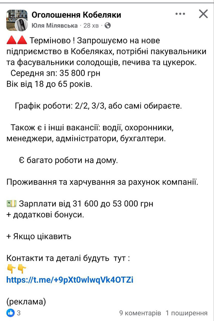 Днями в соцмережах кобелячанам почали пропонувати роботу на взагалі не названому підприємстві. Зарплата, як завжди, висока, а робота легка і не висококваліфікована.
