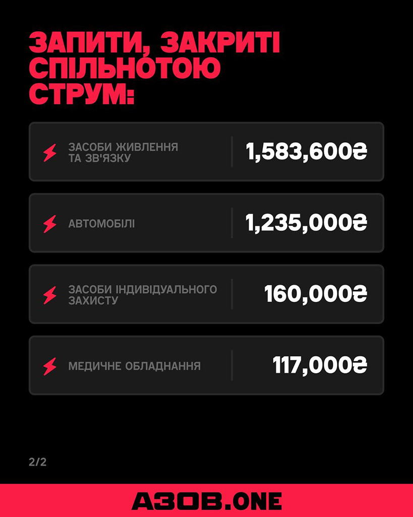 - кожен місяць AZOV.ONE публікує докладні звіти з фото, сумами та переліком техніки, яку отримала бригада.