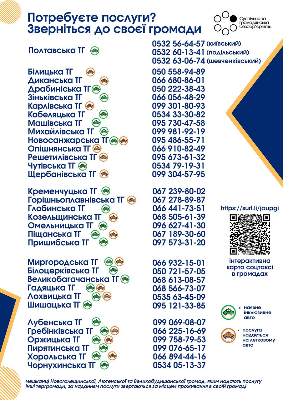 Для зручності контактні номери центрів оформлено в інфографіку, а також розроблено інтерактивну карту «соцтаксі», яка доступна за посиланням https://surl.li/ftauyn