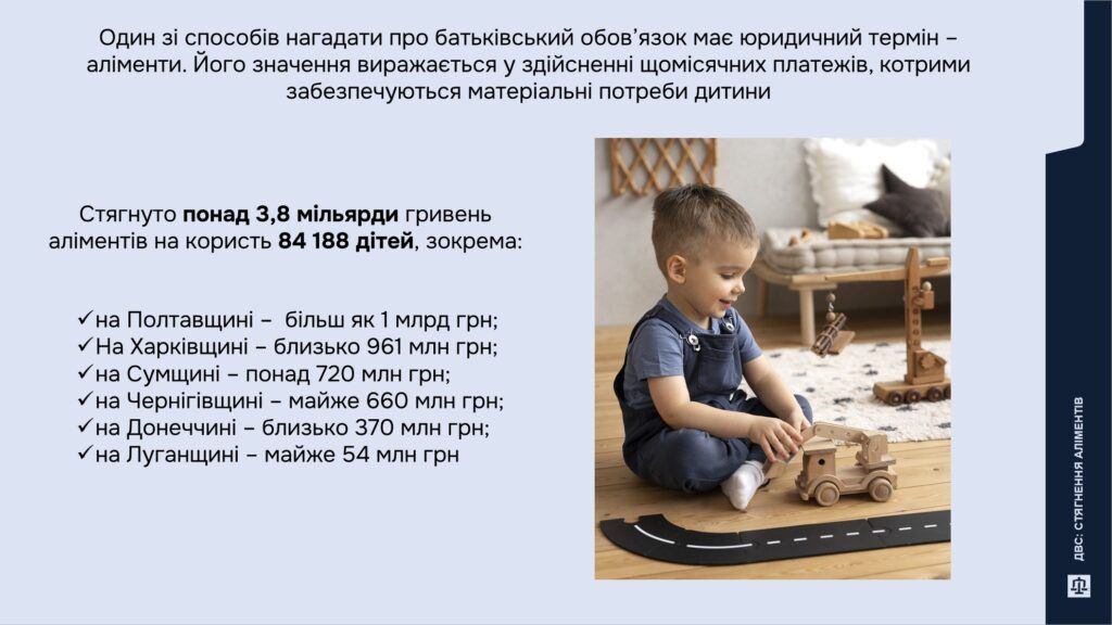 Загалом у 2025 році фахівці стягнули аліменти на суму понад 3,8 млрд грн для 84 188 дітей. Полтавщина очолила рейтинг із понад 1 млрд грн, спрямованих на потреби дітей. На другому місці - Харківщина, потім ідуть СУщина, Чернігівщина, Донеччина. Найменше коштів на дітей було стягнуто у Луганській області — близько 54 млн грн.