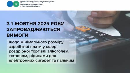 У Головному управлінні ДПС у Полтавській області повідомляють, що для суб’єктів господарювання, які вроздріб торгують алкогольними напоями, тютюновими виробами, рідинами для електронних сигарет та пальним, з 1 жовтня 2025 року...