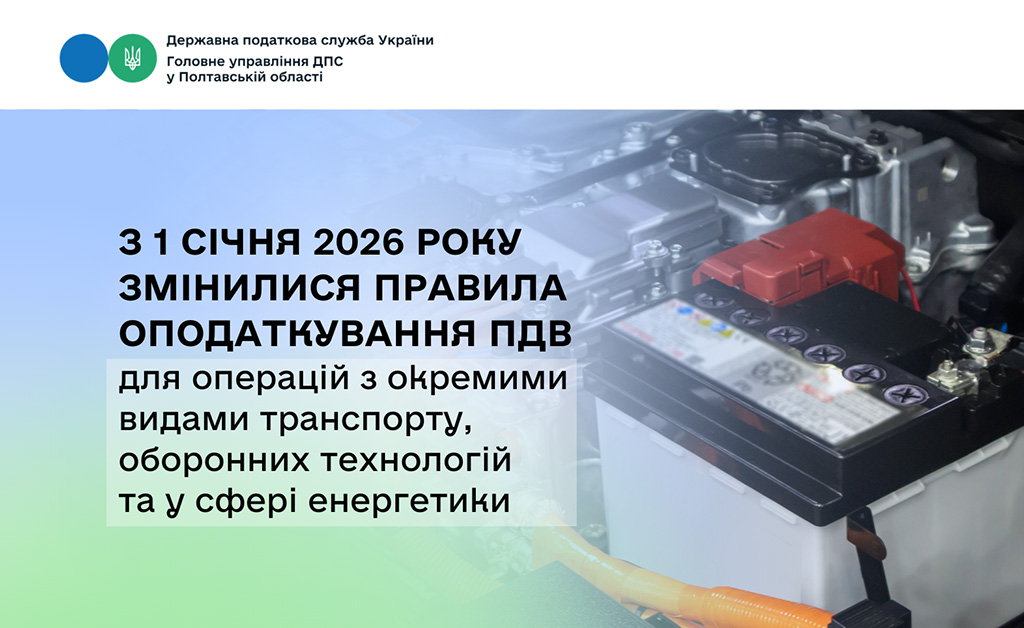 Головне управління ДПС у Полтавській області інформує, що з початку 2026 року в Україні набули чинності новації з оподаткування ПДВ для низки операцій, що стосуються транспорту, оборонної сфери та відновлення енергетичної інфраструктури.